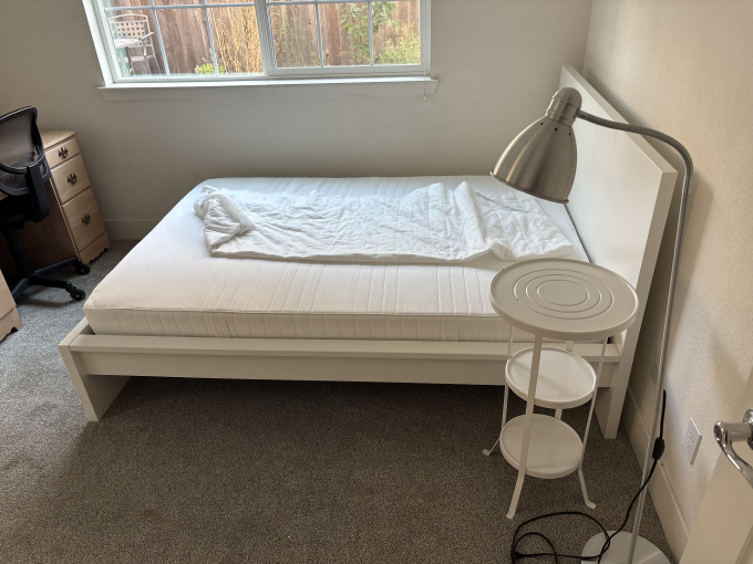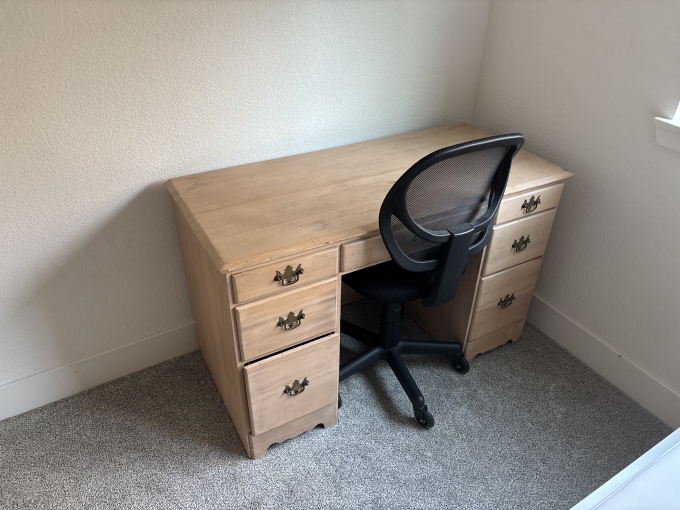 Fully furnished downstairs room: bed, desk, chair, dresser with drawers